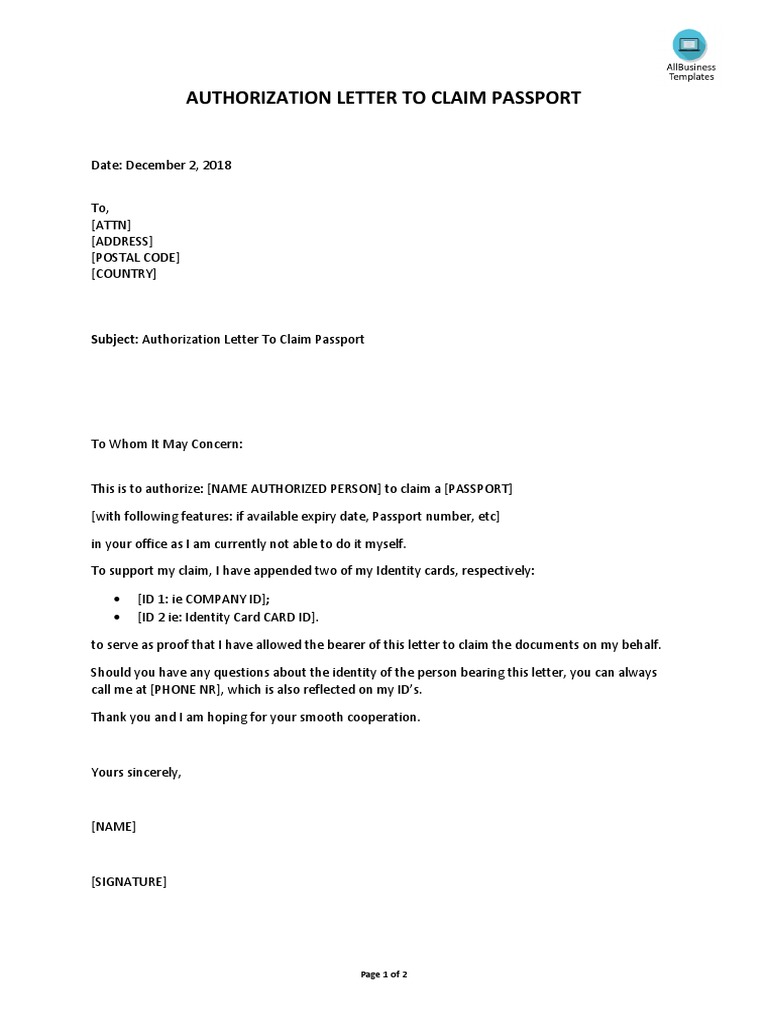 Authorization Letter To Claim My Passport : 1 - The second part includes the firm or the person with whom the original holder is transacting.. Authorization letter to pick up a passport a passport is a significant identification proof and piece of personal information. Authorization letter to collect passport from post office if an authorization letter issued to a person who gives that person the clearance to collect their documents on his behalf. That someone responded to collect are able to use this letter. Remember that subject is the most important part of your letter you must choose it with great care. All you need is an authorization letter to claim.
