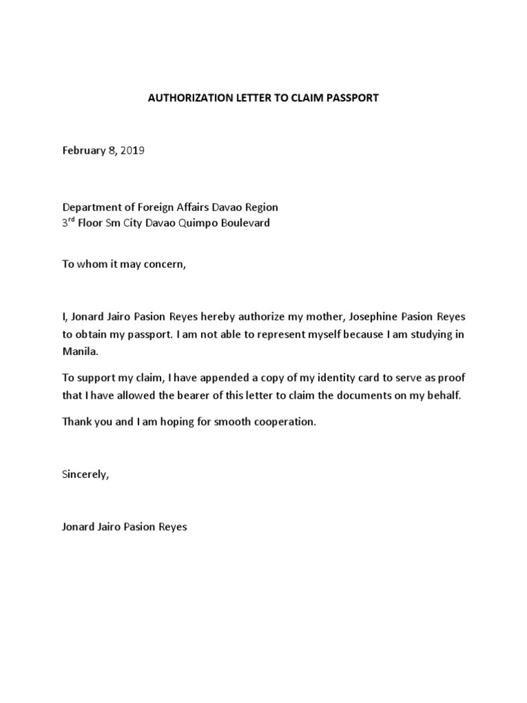 You can also allow someone to claim important document or things for you. Whenever there's a chore that needs to be done in the capital, by default, i am the one to do it. The letter will consist of four parts, and you have to write every personal detail in the first part of the letter like your name in the passport, contact details, address, email, etc. I'm the only one in the family who lives in manila. Any documents like passport, driver's license, health insurance, credit cards, etc. In case the applicant is unable to claim his/her passport, immediate family members* are allowed to claim the passport in behalf of the applicant authorization letter (must mention affiliation with applicant), original dfa issued receipt, valid id (original and photocopy) of applicant and representative Next, include the name of the recipient and the relevant address, which should be complete as well. Our letter of authorization is essentially a 'power of attorney' providing us with proper permission to represent you at the us department of state's passport agency. One suggestion for writing a letter of authorization for claiming visa and passport is to be very specific and detailed. Be it applying for an nso/psa birth certificate or dswd travel clearance or claiming a visa or passport, the task falls on my. Letter of authorization instructions thank you for trusting fastport passport with your expedited passport processing. If the form is filled out incorrectly, it will delay the issuance of your passport. Once your application is processed and the passport is ready, you need to collect it from the office physically.
